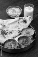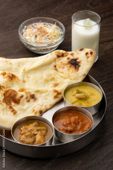 サラダとラッシーが添えられたナンと3種類のカレーセットのアップ