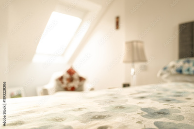 Shallow focus of a a textile duvet cover seen on a large bed in a first floor show home. A skylight window lets in a great deal of natural light.