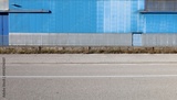 Metal grid railing fence with a large blue industrial building on behind. Multiple lane road in front. Background for copy space.