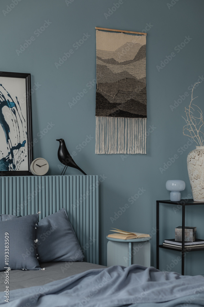 A contemporary bedroom setup with wooden furniture, cozy throws, and natural lighting. Home decor.