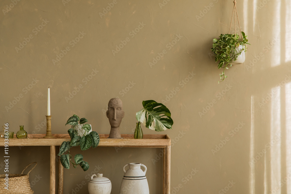 Elegant shelving with greenery, ceramics, and natural textures. A warm, earthy palette complemented by soft shadows.