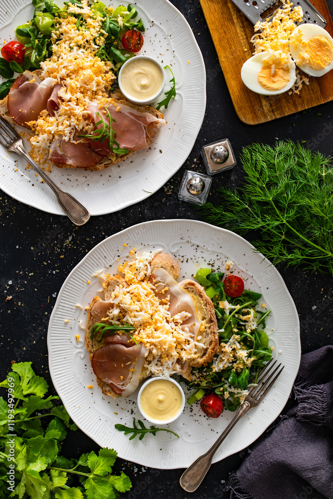 Grated egg toast with cured ham and greens served with mayonnaise on black table