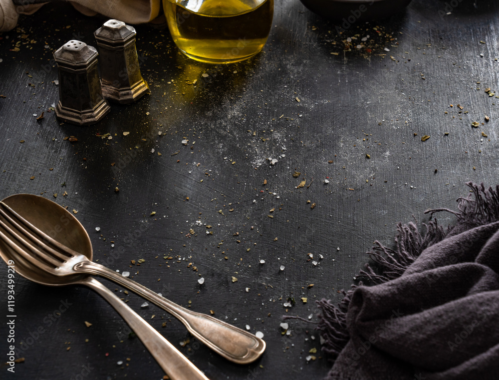 Empty black table with olive oil, salt and pepper, napkin and cutlery on side