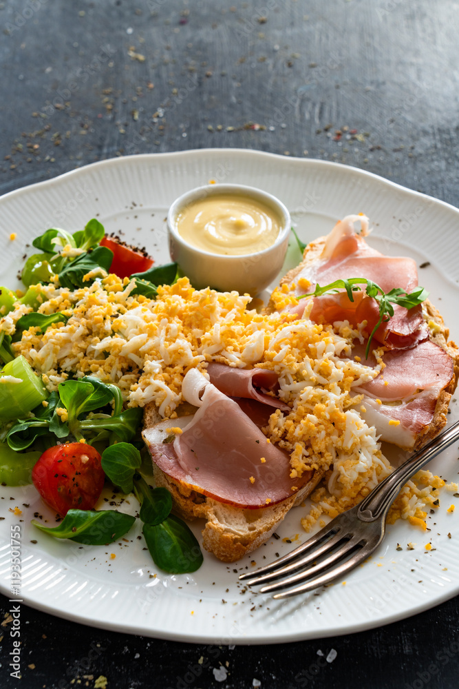 Grated egg toast with cured ham and greens served with mayonnaise on black table