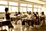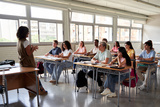 Diverse group of students attentively listening to their teacher in a bright classroom. The teacher stands at the front, engaging the class. The scene highlights education, learning and collaboration.