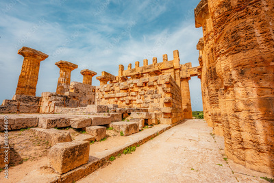 Greek temples at Selinunte of Temple of Hera Temple E with ruins of Greek columns in Selinunte Archaeological Park Sicily Italy