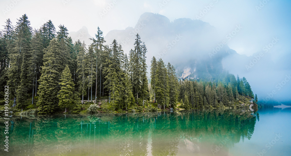 Lago di Braies or Pragser Wildsee lake with boats and fishing dock.Fanes-Sennes-Braies national park in Dolomiti Alps, South Tyrol, Italy