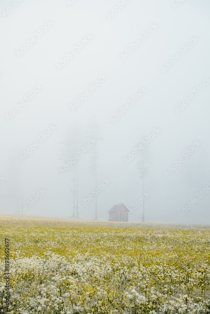 traditional wooden cabin in the dolomites in the fog with trees near lago di braies
