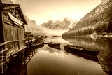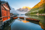 Lago di Braies or Pragser Wildsee lake with boats and fishing dock.Fanes-Sennes-Braies national park in Dolomiti Alps, South Tyrol, Italy