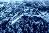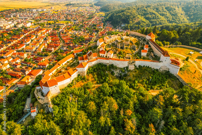 Aerial view of Rasnov Fortress and Rasnov city and forest around in Brasov, Transylvania, Romania