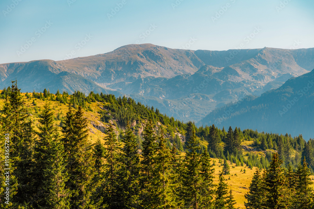 Romania Transalpina road with many serpentines crossing forest in Carpathian mountains. Mountains forest trees with road in Parang mountains