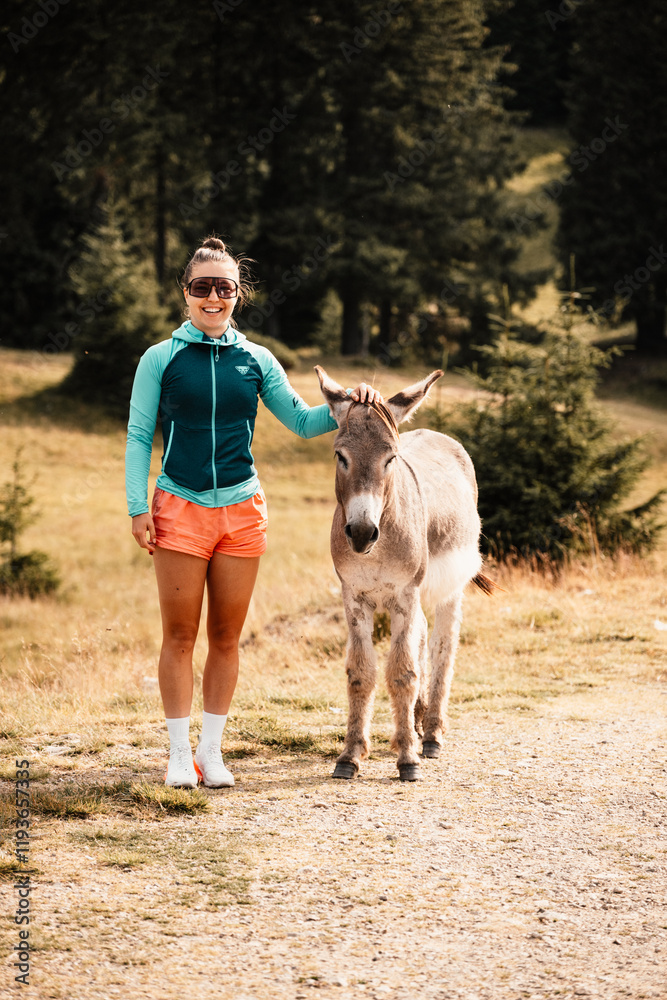 Romania Transalpina road with many serpentines crossing forest in Carpathian mountains. Mountains forest trees with donkey on road in Parang mountains