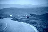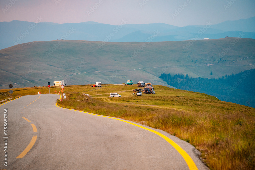 Romania Transalpina road with many serpentines crossing forest in Carpathian mountains. Mountains forest trees with road in Parang mountains