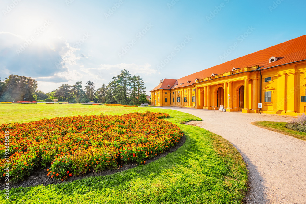 Lednice Chateau with beautiful gardens and parks. Lednice Valtice Landscape, South Moravian region. UNESCO World Heritage Site.