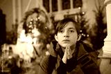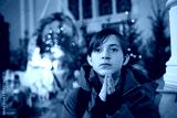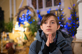 boy in blue jacket prays to God in front of nativity scene in catholic church