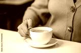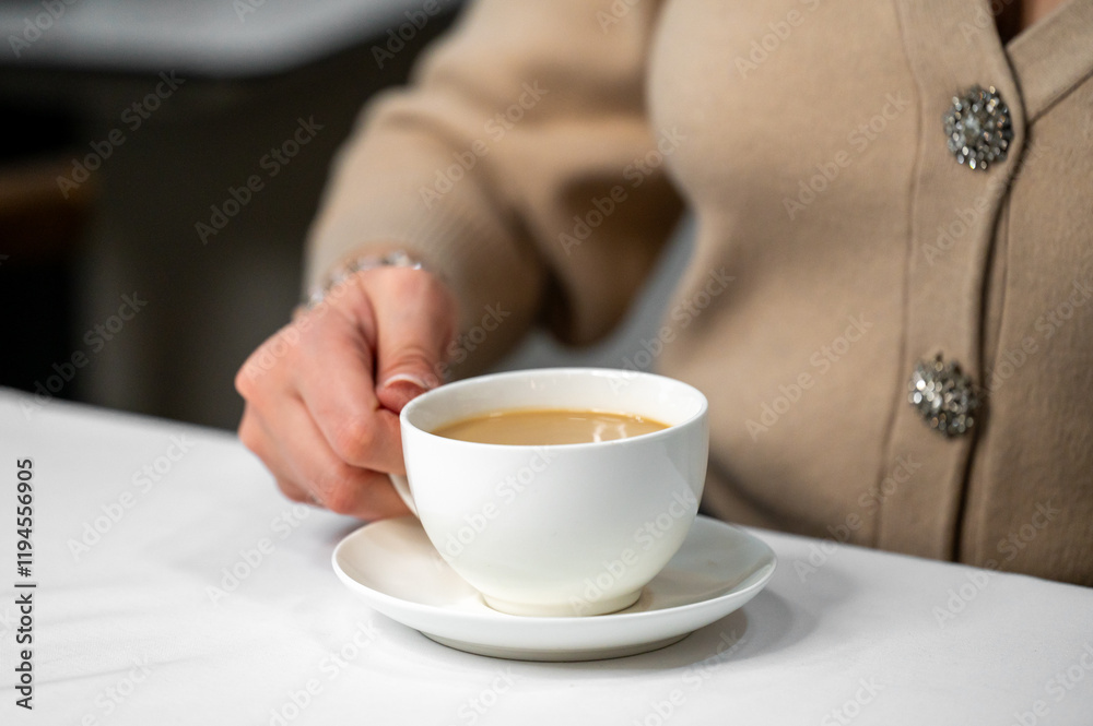 A close-up of a person's hand holding a white cup of coffee on a saucer. The background features a soft, blurred setting, creating a cozy atmosphere ideal for coffee moments.