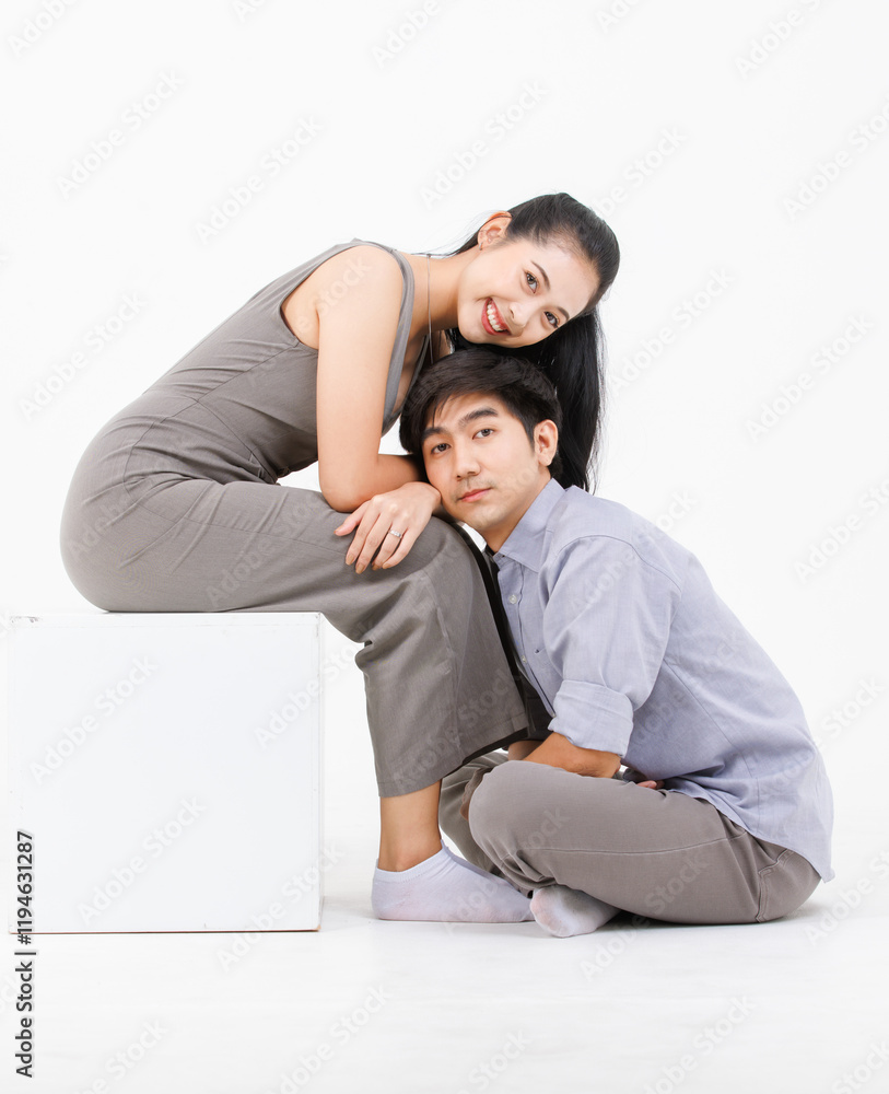 Portrait of lovely young asian happy attractive cheerful couple love, Joyful sweethearts enjoy good time romantic date, sitting on a box posing to camera smiling against together on white background.