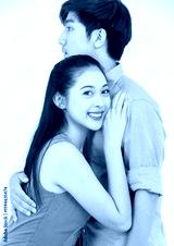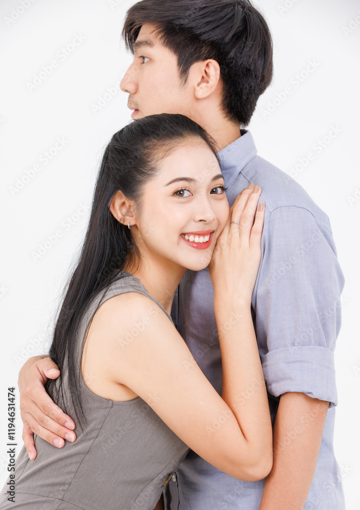 Portrait of young asian happy attractive cheerful couple love, Joyful sweethearts embracing cuddle enjoy good time romantic date, posing to camera smiling together on white background Valentine's Day