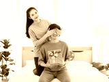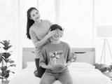 Portrait of young asian happy couple love surprise gift moment woman presenting man with box covering his eye with her palm sweethearts for Valentine's day in bedroom at home enjoy good time together