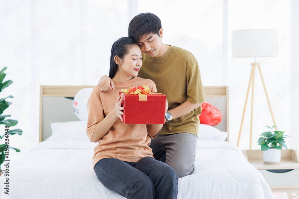 Portrait of young lovely sweet romantic asian happy couple love hugging embracing holding gift box presenting for Valentine's day sitting on the bed in bedroom at home smiling enjoy good time together