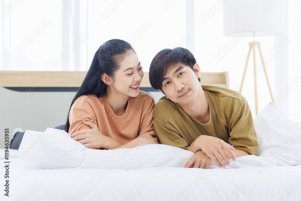 Portrait of young asian lovely sweet attractive cheerful happy couple love smile playing and relax on white bed in bedroom at home good time romantic together Valentine's Day and relationship concept.
