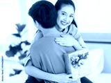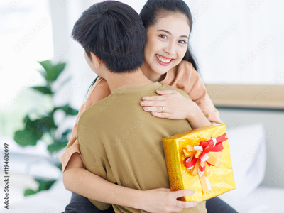 Portrait of young asian happy couple love surprise gift moment man hugging gives presenting gift box to his beloved woman in bedroom at home Valentine's day romantic surprise enjoy good time together.