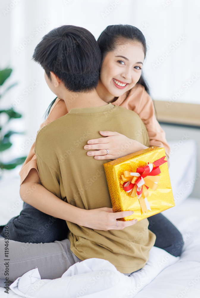 Portrait of young asian happy couple love surprise gift moment man hugging gives presenting gift box to his beloved woman in bedroom at home Valentine's day romantic surprise enjoy good time together.