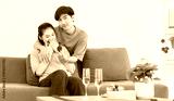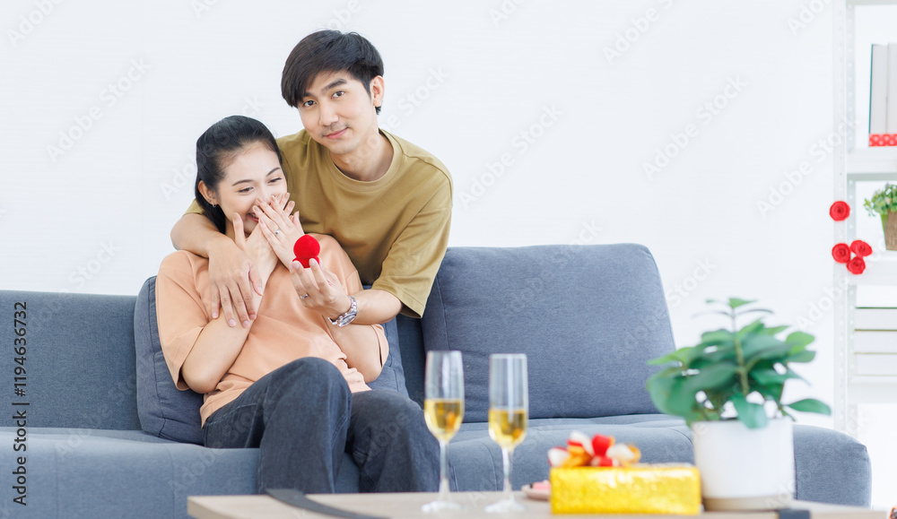 Asian young happy attractive couple love sweethearts smile hugging gives surprise wedding diamond ring sitting on cozy sofa in living room at home to Valentine's day romantic enjoy good time together.