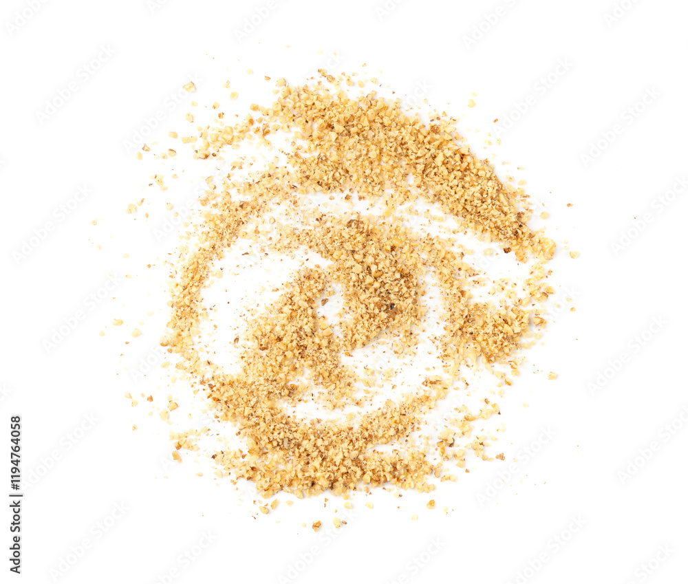 Grated wallnut , broken roasted walnuts, heap of nuts crumbs, whole kernel pieces, fractions