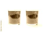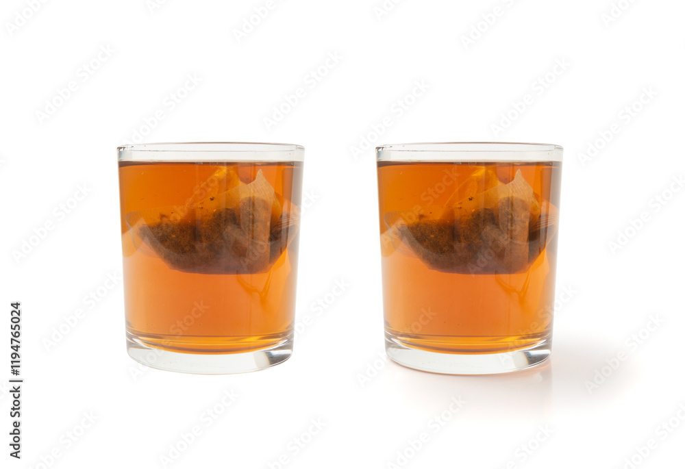 Herbal tea sachet in glass, hot water with chamomile and Hypericum or St. John's wort teabag
