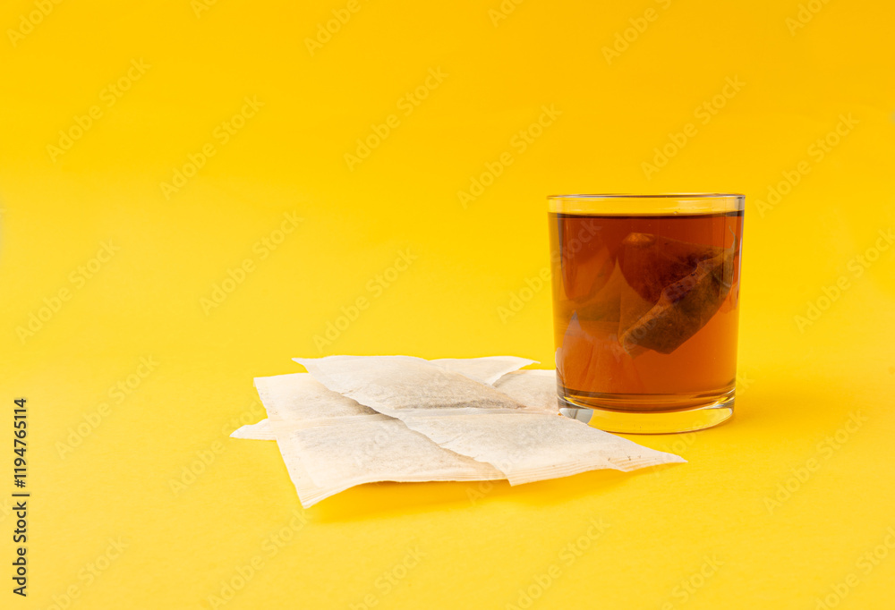 Herbal tea sachet in glass, hot water with chamomile and Hypericum or St. John's wort teabag