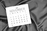 November 2025 Monthly desk calendar on red silk textile background.