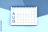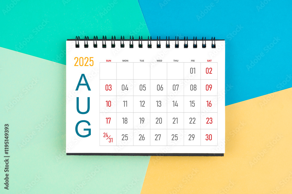 August 2025 month blank desk calendar on colorful background.