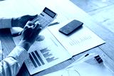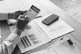 A businessman analyzing financial charts and data on a digital tablet in a modern office. Surrounded by reports, graphs, and a laptop, he plans strategies for growth, investment, and corporate success