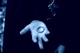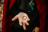 Boy cosplayer in hobbit cape costume holds golden ring. Fantasy journey, halloween, fellowship cosplay