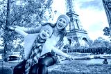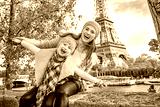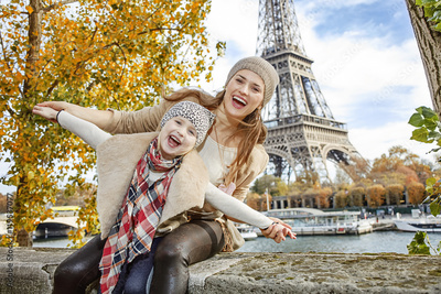 smiling mother and daughter travellers having fun time in Paris