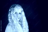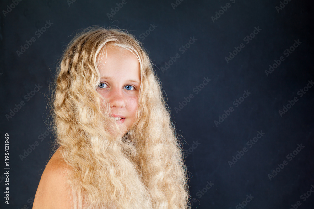 Happy blond young girl with long healthy curly hair on black background, fashion portrait