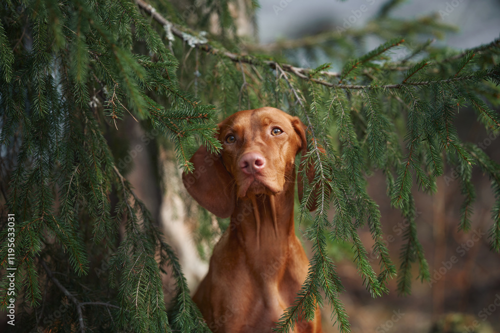 A Viszla dog gazing thoughtfully at the edge of a forest, framed by overhanging branches. The moment reflects the dog calm and contemplative nature in the wild.