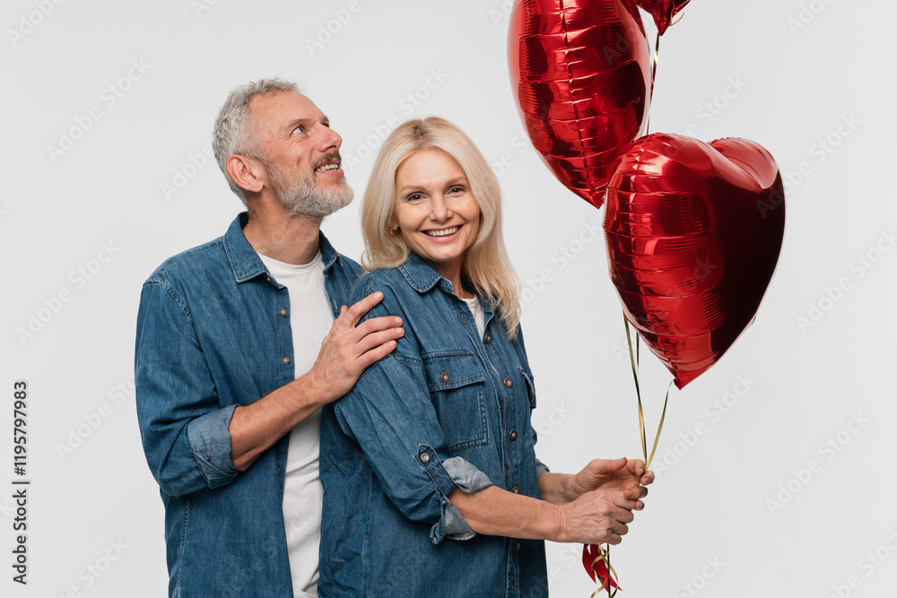Studio portrait of happy mature husband and wife wearing casual clothes smiling couple hugging holding red heart shape balloon standing isolated white background. St. Valentine's Day concept