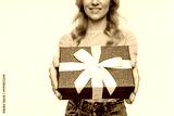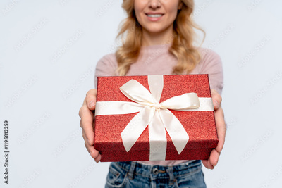 Close up of Caucasian woman holding giving red present box gift with white ribbon bow while standing and looking at camera isolated over white background. Valentine's Day 14 February 8 march concept.