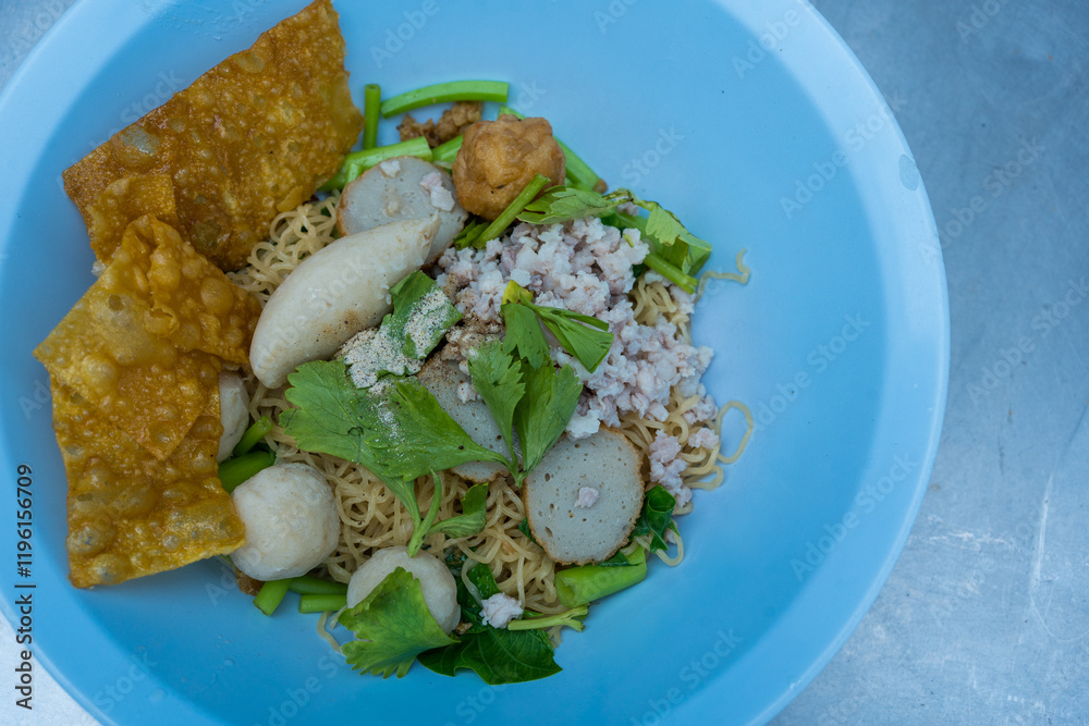 Egg noodles dried egg noodles with minced pork, fish meatballs, and fried dumplings in blue bowl.
