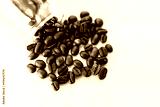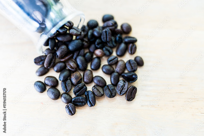 Roasted coffee beans on wood table.