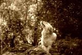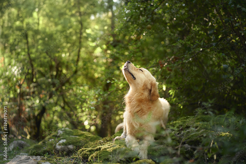 A Nova Scotia Duck Tolling Retriever looks up in a forest. Surrounded by green foliage, the dog appears attentive and curious amidst the dense nature setting.