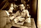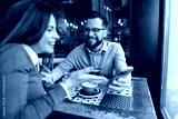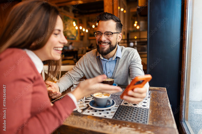 Happy loving couple sitting in cafeteria and smiling at memes on cellphone.