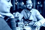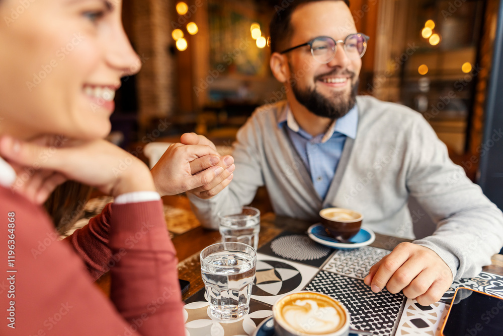 Selective focus on couple's hands. Young affectionate couple on a date in coffee shop.