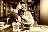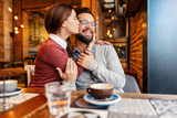 Young happy romantic couple kissing and enjoying Valentines day in cafeteria.