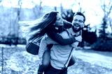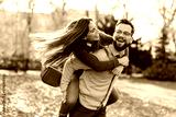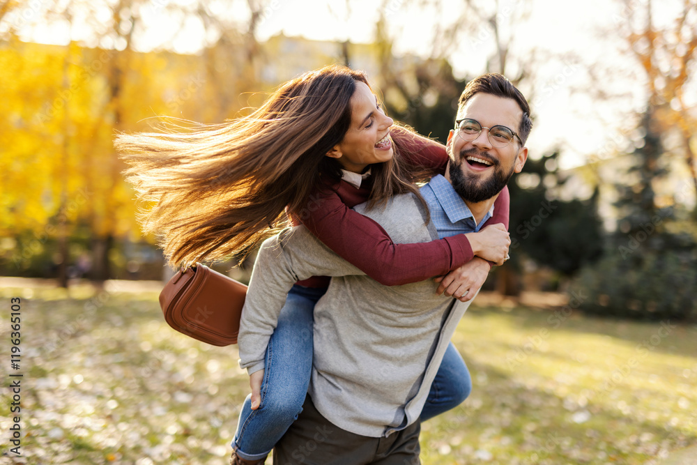 Young happy fun affectionate couple having piggyback ride in city park on Valentines day.