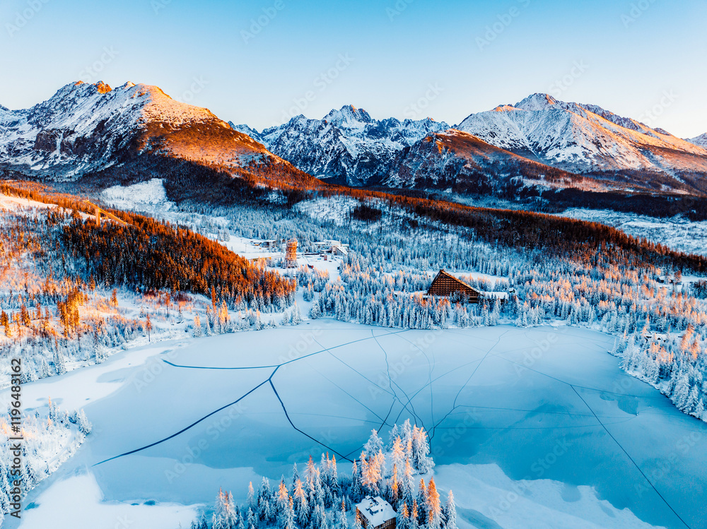 Frozen winter mountain lake Strbske pleso. Strbske lake with view of the High Tatras National Park, Slovakia