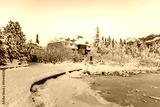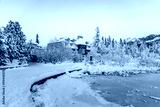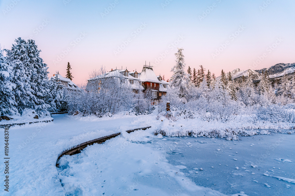 Frozen winter mountain lake Strbske pleso. Strbske lake with view of the High Tatras National Park, Slovakia