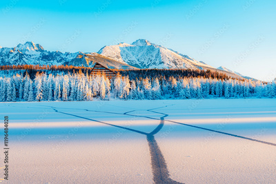 Frozen winter mountain lake Strbske pleso. Strbske lake with view of the High Tatras National Park, Slovakia
